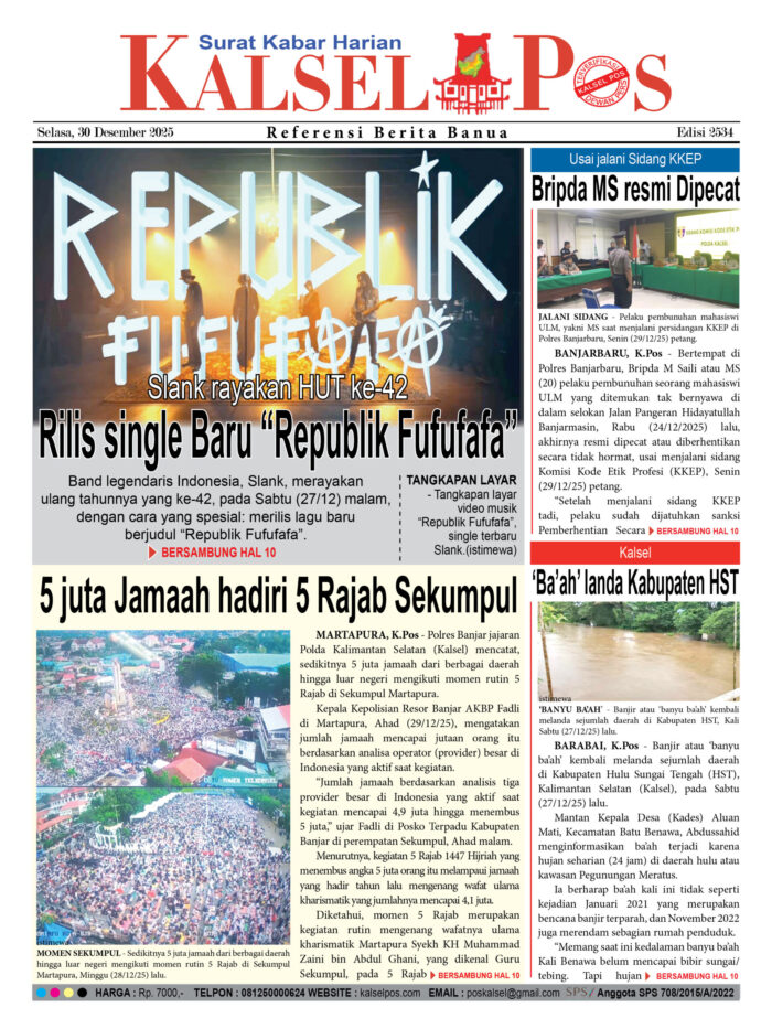 Slank rayakan HUT ke-42, Rilis single Baru “Republik Fufufafa” Zainal30 Desember 2025470 views Slank rayakan HUT ke-42, Rilis single Baru “Republik Fufufafa” 5 juta Jamaah hadiri 5 Rajab Sekumpul Usai jalani Sidang KKEP, Bripda MS resmi Dipecat ‘Ba’ah’ landa Kabupaten HST Download Epaper PDF Disini Bacaan LainnyaKUHP baru Lebih Untungkan Terdakwa, PN Barabai terapkan di Kasus PenganiayaanSampah Besar kiriman Hulu di Sungai Martapura, Berpotensi ‘hantam’ Jembatan67 ribu warga Terancam tak Terlindungi JKN Download Epaper PDF Disini Kalsel Pos Berita Terkini, Kabar Terbaru Hari ini Banjarmasin Kalimantan Selatan dan Nasional Pos terkaitKUHP baru Lebih Untungkan Terdakwa, PN Barabai terapkan di Kasus PenganiayaanSampah Besar kiriman Hulu di Sungai Martapura, Berpotensi ‘hantam’ Jembatan67 ribu warga Terancam tak Terlindungi JKN
