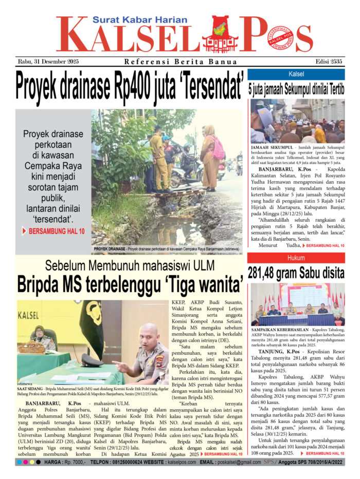 Proyek drainase Rp400 juta ‘Tersendat’ Zainal31 Desember 2025715 views Proyek drainase Rp400 juta ‘Tersendat’ Sebelum Membunuh mahasiswi ULM, Bripda MS terbelenggu ‘Tiga wanita’ 5 juta jamaah Sekumpul dinilai Tertib 281,48 gram Sabu disita Download Epaper PDF Disini Bacaan LainnyaTerkait Korupsi Dana Desa Rp657 juta, Eks Kades di Kusan Hilir divonis 3 TahunDireksi baru PAM Bandarmasih terbentuk, Zulbadi dipercaya jadi DirutParkir Pasar Wadai ‘mencekik’, Pengendara Motor ditagih Rp10 Ribu Download Epaper PDF Disini Kalsel Pos Berita Terkini, Kabar Terbaru Hari ini Banjarmasin Kalimantan Selatan dan Nasional Pos terkaitTerkait Korupsi Dana Desa Rp657 juta, Eks Kades di Kusan Hilir divonis 3 TahunDireksi baru PAM Bandarmasih terbentuk, Zulbadi dipercaya jadi DirutParkir Pasar Wadai ‘mencekik’, Pengendara Motor ditagih Rp10 Ribu