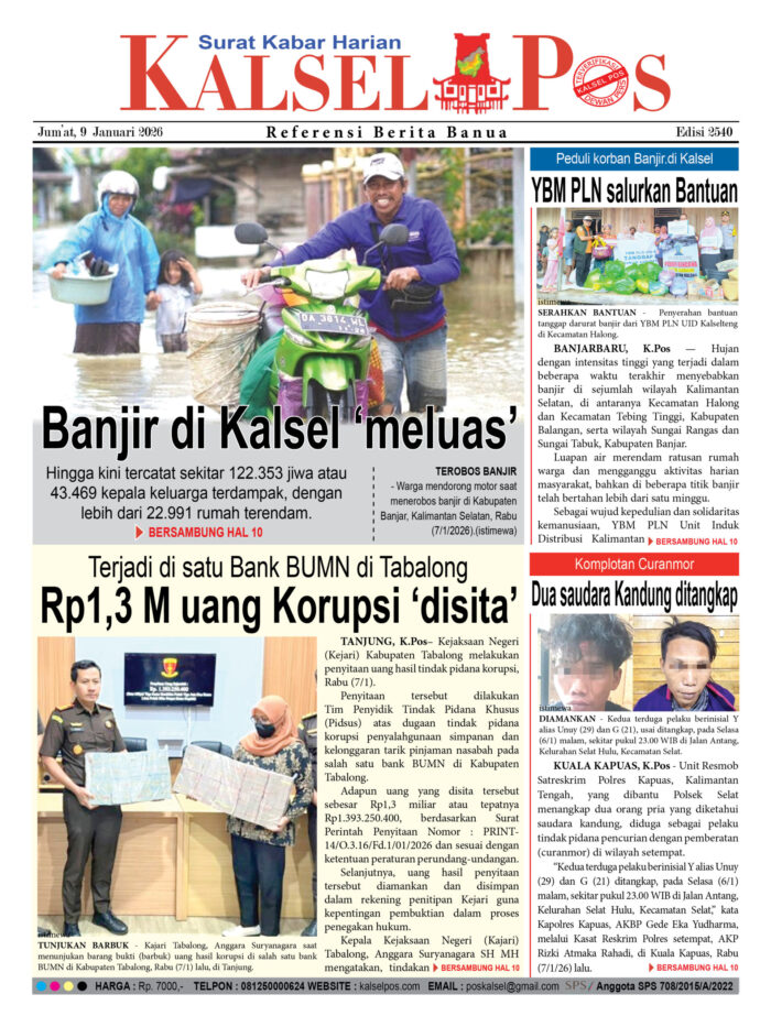Banjir di Kalsel ‘meluas’ Zainal8 Januari 20269 Januari 2026903 views Banjir di Kalsel ‘meluas’ Terjadi di satu Bank BUMN di Tabalong, Rp1,3 M uang Korupsi ‘disita’ Peduli korban Banjir.di Kalsel, YBM PLN salurkan Bantuan Komplotan Curanmor, Dua saudara Kandung ditangkap Download Epaper PDF Disini Bacaan Lainnya67 ribu warga Terancam tak Terlindungi JKNDiduga ‘didominasi’ Satu orang, Pelaksanaan Musprov Percasi tuai Tanya ?Tanpa bantuan Medis, Terpaksa melahirkan di Mobil Operasional Desa Download Epaper PDF Disini Kalsel Pos Berita Terkini, Kabar Terbaru Hari ini Banjarmasin Kalimantan Selatan dan Nasional Pos terkait67 ribu warga Terancam tak Terlindungi JKNDiduga ‘didominasi’ Satu orang, Pelaksanaan Musprov Percasi tuai Tanya ?Tanpa bantuan Medis, Terpaksa melahirkan di Mobil Operasional Desa
