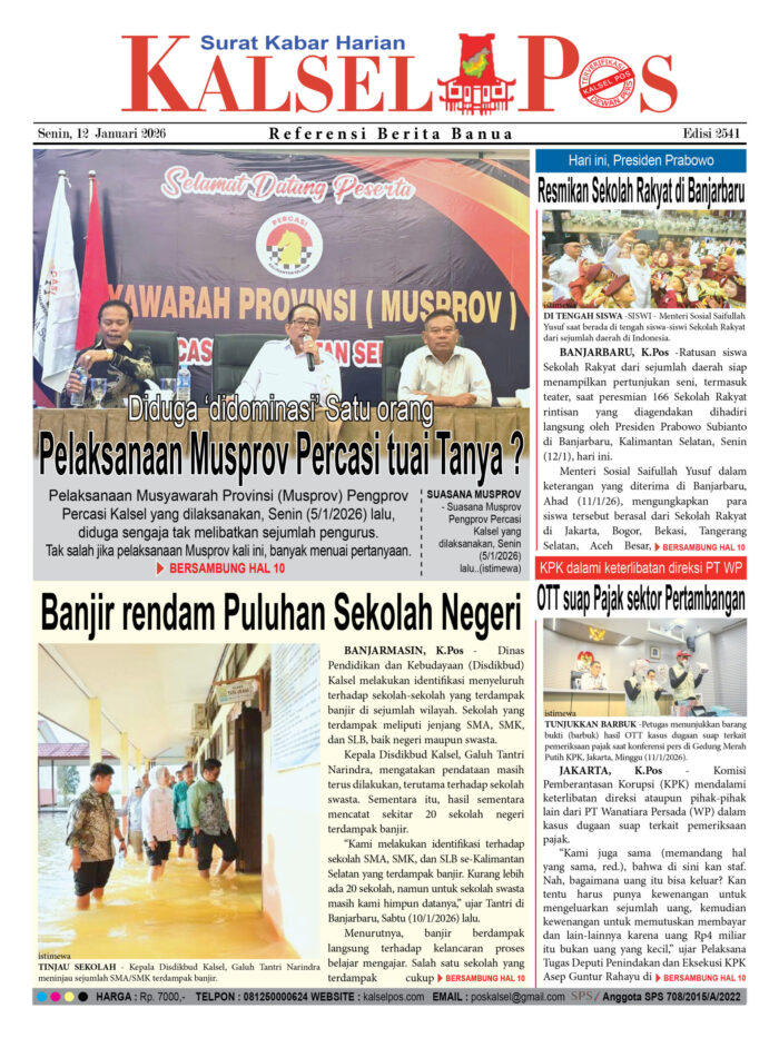 Diduga ‘didominasi’ Satu orang, Pelaksanaan Musprov Percasi tuai Tanya ? Zainal12 Januari 2026896 views Diduga ‘didominasi’ Satu orang, Pelaksanaan Musprov Percasi tuai Tanya ? Banjir rendam Puluhan Sekolah Negeri Hari ini, Presiden Prabowo,Resmikan Sekolah Rakyat di Banjarbaru OTT suap Pajak sektor Pertambangan, KPK dalami keterlibatan direksi PT WP Download Epaper PDF Disini Bacaan Lainnya67 ribu warga Terancam tak Terlindungi JKNBanjir di Kalsel ‘meluas’Tanpa bantuan Medis, Terpaksa melahirkan di Mobil Operasional Desa Download Epaper PDF Disini Kalsel Pos Berita Terkini, Kabar Terbaru Hari ini Banjarmasin Kalimantan Selatan dan Nasional Pos terkait67 ribu warga Terancam tak Terlindungi JKNBanjir di Kalsel ‘meluas’Tanpa bantuan Medis, Terpaksa melahirkan di Mobil Operasional Desa