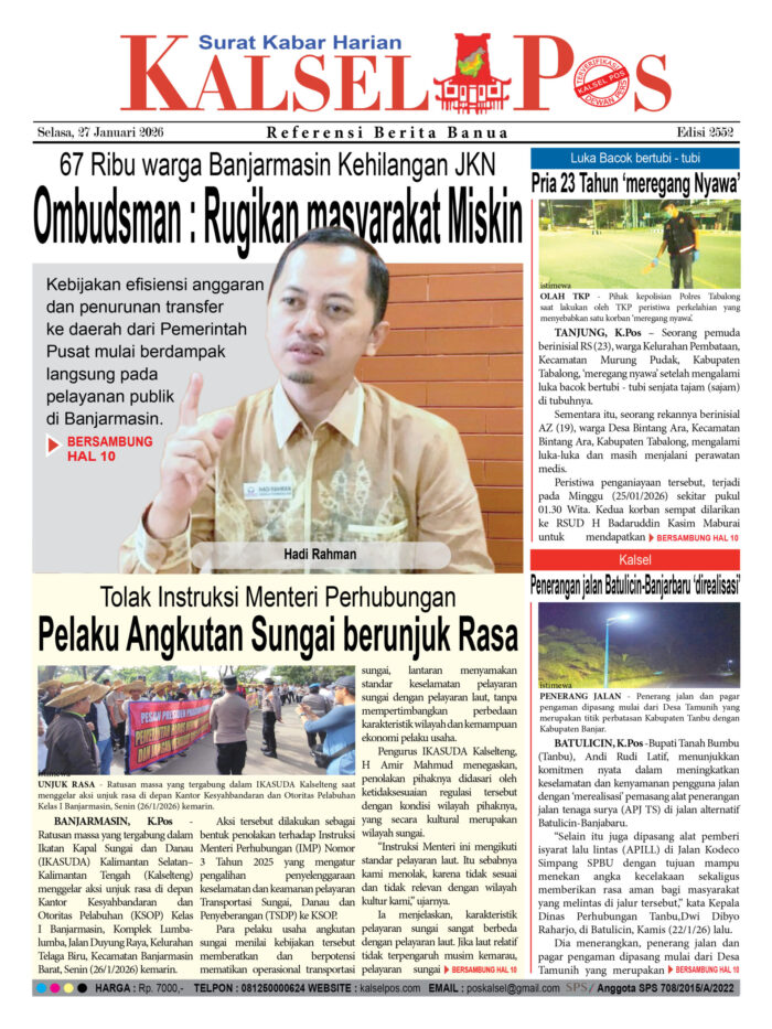 Ombudsman : Rugikan masyarakat Miskin, 67 Ribu warga Banjarmasin Kehilangan JKN Zainal27 Januari 2026281 views Ombudsman : Rugikan masyarakat Miskin, 67 Ribu warga Banjarmasin Kehilangan JKN Pelaku Angkutan Sungai berunjuk Rasa, Tolak Instruksi Menteri Perhubungan Pria 23 Tahun ‘meregang Nyawa’, Luka Bacok bertubi – tubi Penerangan jalan Batulicin-Banjarbaru ‘direalisasi’ Download Epaper PDF Disini Bacaan LainnyaTerkait Korupsi Dana Desa Rp657 juta, Eks Kades di Kusan Hilir divonis 3 TahunDireksi baru PAM Bandarmasih terbentuk, Zulbadi dipercaya jadi DirutParkir Pasar Wadai ‘mencekik’, Pengendara Motor ditagih Rp10 Ribu Download Epaper PDF Disini Kalsel Pos Berita Terkini, Kabar Terbaru Hari ini Banjarmasin Kalimantan Selatan dan Nasional Pos terkaitTerkait Korupsi Dana Desa Rp657 juta, Eks Kades di Kusan Hilir divonis 3 TahunDireksi baru PAM Bandarmasih terbentuk, Zulbadi dipercaya jadi DirutParkir Pasar Wadai ‘mencekik’, Pengendara Motor ditagih Rp10 Ribu