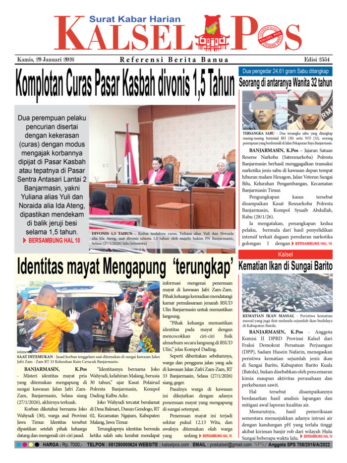 Komplotan Curas Pasar Kasbah divonis 1,5 Tahun Zainal29 Januari 2026440 views Komplotan Curas Pasar Kasbah divonis 1,5 Tahun Identitas mayat Mengapung ‘terungkap’ Dua pengedar 24,61 gram Sabu ditangkap Kematian Ikan di Sungai Barito Download Epaper PDF Disini Bacaan LainnyaTerkait Korupsi Dana Desa Rp657 juta, Eks Kades di Kusan Hilir divonis 3 TahunDireksi baru PAM Bandarmasih terbentuk, Zulbadi dipercaya jadi DirutParkir Pasar Wadai ‘mencekik’, Pengendara Motor ditagih Rp10 Ribu Download Epaper PDF Disini Kalsel Pos Berita Terkini, Kabar Terbaru Hari ini Banjarmasin Kalimantan Selatan dan Nasional Pos terkaitTerkait Korupsi Dana Desa Rp657 juta, Eks Kades di Kusan Hilir divonis 3 TahunDireksi baru PAM Bandarmasih terbentuk, Zulbadi dipercaya jadi DirutParkir Pasar Wadai ‘mencekik’, Pengendara Motor ditagih Rp10 Ribu