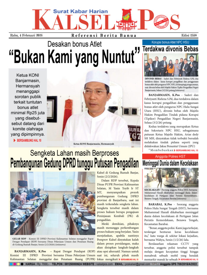 Desakan bonus Atlet, “Bukan Kami yang Nuntut” Zainal4 Februari 2026461 views Desakan bonus Atlet, “Bukan Kami yang Nuntut” Pembangunan Gedung DPRD tunggu Putusan Pengadilan Korupsi bonus Atlet NPC HSU, Terdakwa divonis Bebas Anggota Polres HST, Meninggal Dunia dalam Kecelakaan Download Epaper PDF Disini Bacaan LainnyaTerkait Korupsi Dana Desa Rp657 juta, Eks Kades di Kusan Hilir divonis 3 TahunDireksi baru PAM Bandarmasih terbentuk, Zulbadi dipercaya jadi DirutParkir Pasar Wadai ‘mencekik’, Pengendara Motor ditagih Rp10 Ribu Download Epaper PDF Disini Kalsel Pos Berita Terkini, Kabar Terbaru Hari ini Banjarmasin Kalimantan Selatan dan Nasional Pos terkaitTerkait Korupsi Dana Desa Rp657 juta, Eks Kades di Kusan Hilir divonis 3 TahunDireksi baru PAM Bandarmasih terbentuk, Zulbadi dipercaya jadi DirutParkir Pasar Wadai ‘mencekik’, Pengendara Motor ditagih Rp10 Ribu
