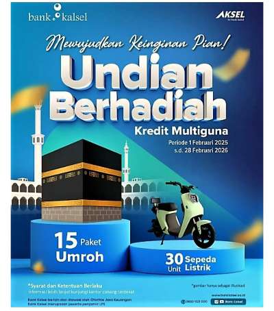Banjarmasin, kalselpos.com – Bank Kalsel membuka kesempatan bagi nasabah untuk mewujudkan impian beribadah ke Tanah Suci sekaligus memiliki kendaraan ramah lingkungan secara gratis. Melalui program undian terbaru, Bank Kalsel menyiapkan hadiah total berupa 15 Paket Umrah dan 30 unit sepeda listrik bagi nasabah yang beruntung.