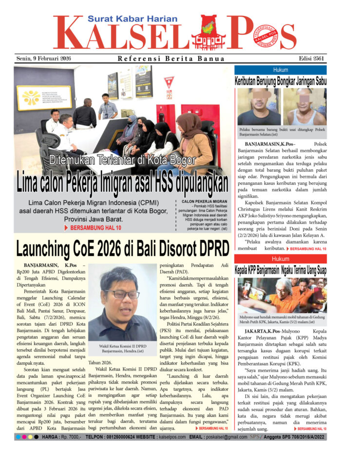 Ditemukan Terlantar di Kota Bogor, Lima calon Pekerja Imigran asal HSS dipulangkan Zainal9 Februari 2026524 views Ditemukan Terlantar di Kota Bogor, Lima calon Pekerja Imigran asal HSS dipulangkan Launching CoE 2026 di Bali Disorot DPRD Keributan Berujung Bongkar Jaringan Sabu Kepala KPP Banjarmasin Ngaku Terima Uang Suap Download Epaper PDF Disini Bacaan LainnyaKampung Ketupat ‘terbengkalai’Tukang Sate simpan 9,3 gram SabuTersangka Pembunuh mahasiswi ULM dilimpahkan Download Epaper PDF Disini Kalsel Pos Berita Terkini, Kabar Terbaru Hari ini Banjarmasin Kalimantan Selatan dan Nasional Pos terkaitKampung Ketupat ‘terbengkalai’Tukang Sate simpan 9,3 gram SabuTersangka Pembunuh mahasiswi ULM dilimpahkan