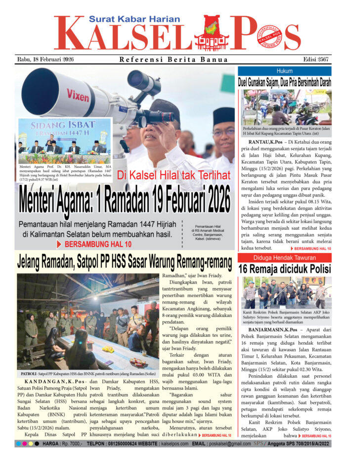 Menteri Agama: 1 Ramadan 19 Februari 2026 Zainal17 Februari 2026276 views Menteri Agama: 1 Ramadan 19 Februari 2026 Jelang Ramadan, Satpol PP HSS Sasar Warung Remang-remang Duel Gunakan Sajam, Dua Pria Bersimbah Darah 16 Remaja diciduk Polisi, Diduga Hendak Tawuran Download Epaper PDF Disini Bacaan LainnyaKampung Ketupat ‘terbengkalai’Tukang Sate simpan 9,3 gram SabuTersangka Pembunuh mahasiswi ULM dilimpahkan Download Epaper PDF Disini Kalsel Pos Berita Terkini, Kabar Terbaru Hari ini Banjarmasin Kalimantan Selatan dan Nasional Pos terkaitKampung Ketupat ‘terbengkalai’Tukang Sate simpan 9,3 gram SabuTersangka Pembunuh mahasiswi ULM dilimpahkan