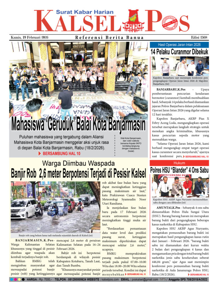 Mahasiswa ‘Geruduk’ Balai Kota Banjarmasin Zainal19 Februari 2026351 views Mahasiswa ‘Geruduk’ Balai Kota Banjarmasin Banjir Rob 2,6 meter Berpotensi Terjadi di Pesisir Kalsel Hasil Operasi Jaran Intan 2026 Polres HSU “Blander” 4 Ons Sabu Download Epaper PDF Disini Bacaan LainnyaTerkait Korupsi Dana Desa Rp657 juta, Eks Kades di Kusan Hilir divonis 3 TahunDireksi baru PAM Bandarmasih terbentuk, Zulbadi dipercaya jadi DirutParkir Pasar Wadai ‘mencekik’, Pengendara Motor ditagih Rp10 Ribu Download Epaper PDF Disini Kalsel Pos Berita Terkini, Kabar Terbaru Hari ini Banjarmasin Kalimantan Selatan dan Nasional Pos terkaitTerkait Korupsi Dana Desa Rp657 juta, Eks Kades di Kusan Hilir divonis 3 TahunDireksi baru PAM Bandarmasih terbentuk, Zulbadi dipercaya jadi DirutParkir Pasar Wadai ‘mencekik’, Pengendara Motor ditagih Rp10 Ribu