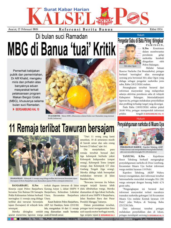 Di bulan suci Ramadan, MBG di Banua ‘tuai’ Kritik Zainal26 Februari 2026328 views Di bulan suci Ramadan, MBG di Banua ‘tuai’ Kritik 11 Remaja terlibat Tawuran bersajam Pengedar Sabu di Batu Piring ‘diringkus’ Penyalahgunaan narkoba di Muara Uya Download Epaper PDF Disini Bacaan LainnyaDugaan Korupsi dan Pemerasan di Kejari HSU , Bendahara dan Staf ikut ‘dipanggil’18 IUP Tambang di Banua, Diduga beroperasi tanpa miliki AMDALPembunuh Bidan divonis Seumur Hidup Download Epaper PDF Disini Kalsel Pos Berita Terkini, Kabar Terbaru Hari ini Banjarmasin Kalimantan Selatan dan Nasional Pos terkaitDugaan Korupsi dan Pemerasan di Kejari HSU , Bendahara dan Staf ikut ‘dipanggil’18 IUP Tambang di Banua, Diduga beroperasi tanpa miliki AMDALPembunuh Bidan divonis Seumur Hidup