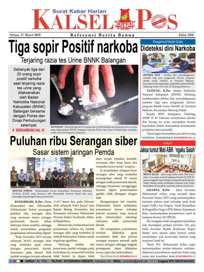 Tiga sopir Positif narkoba, Terjaring razia tes Urine BNNK Balangan Zainal17 Maret 202618 Maret 202662 views Tiga sopir Positif narkoba, Terjaring razia tes Urine BNNK Balangan Puluhan ribu Serangan siber, Sasar sistem jaringan Pemda Pengemudi Mudik Gratis, Dideteksi dini Narkoba Jaksa tuntut Mati ABK ‘ngaku Salah’ Download Epaper PDF Disini Bacaan LainnyaBuruh dikeroyok Hingga Tewas, Tersangka Pelaku Serahkan DiriParkir “Nakal” Pasar Wadai disikat, Lahan yang Tarik Rp10 Ribu disegelTerkait Korupsi Dana Desa Rp657 juta, Eks Kades di Kusan Hilir divonis 3 Tahun Download Epaper PDF Disini Kalsel Pos Berita Terkini, Kabar Terbaru Hari ini Banjarmasin Kalimantan Selatan dan Nasional Pos terkaitBuruh dikeroyok Hingga Tewas, Tersangka Pelaku Serahkan DiriParkir “Nakal” Pasar Wadai disikat, Lahan yang Tarik Rp10 Ribu disegelTerkait Korupsi Dana Desa Rp657 juta, Eks Kades di Kusan Hilir divonis 3 Tahun