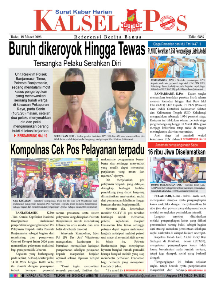 Buruh dikeroyok Hingga Tewas, Tersangka Pelaku Serahkan Diri Zainal18 Maret 202649 views Buruh dikeroyok Hingga Tewas, Tersangka Pelaku Serahkan Diri Kompolnas Cek Pos Pelayanan terpadu Siaga Ramadan dan Idul Fitri 1447 H, PLN UID kerahkan 1.954 Personel jaga Listrik Andal Ancaman penyalahgunaan Sabu, 16 ribu Jiwa Diselamatkan Download Epaper PDF Disini Bacaan LainnyaTiga sopir Positif narkoba, Terjaring razia tes Urine BNNK BalanganParkir “Nakal” Pasar Wadai disikat, Lahan yang Tarik Rp10 Ribu disegelTerkait Korupsi Dana Desa Rp657 juta, Eks Kades di Kusan Hilir divonis 3 Tahun Download Epaper PDF Disini Kalsel Pos Berita Terkini, Kabar Terbaru Hari ini Banjarmasin Kalimantan Selatan dan Nasional Pos terkaitTiga sopir Positif narkoba, Terjaring razia tes Urine BNNK BalanganParkir “Nakal” Pasar Wadai disikat, Lahan yang Tarik Rp10 Ribu disegelTerkait Korupsi Dana Desa Rp657 juta, Eks Kades di Kusan Hilir divonis 3 Tahun