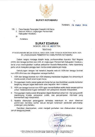 Kotabaru, kalselpos.com – Pemerintah Kabupaten Kotabaru resmi mengeluarkan Surat Edaran Nomor 800.1.6/369/SETDA tentang penggunaan media sosial bagi Aparatur Sipil Negara (ASN) dan tenaga kontrak non-ASN di lingkungan Pemerintah Kabupaten Kotabaru.