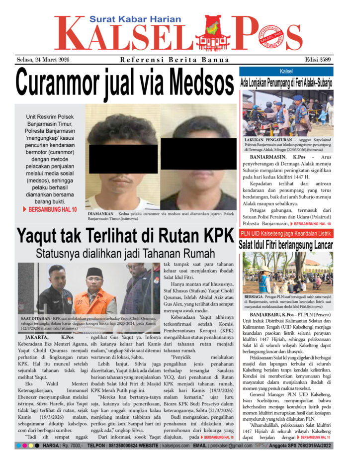 Curanmor jual via Medsos Zainal23 Maret 202645 views Curanmor jual via Medsos Yaqut tak Terlihat di Rutan KPK, Statusnya dialihkan jadi Tahanan Rumah Ada Lonjakan Penumpang di Feri Alalak–Subarjo PLN UID Kalselteng jaga Keandalan Listrik, Salat Idul Fitri berlangsung Lancar Download Epaper PDF Disini Bacaan Lainnya1 Kg Sabu berhasil Disita, Dari seorang Pengedar di HantakanBuruh dikeroyok Hingga Tewas, Tersangka Pelaku Serahkan DiriTiga sopir Positif narkoba, Terjaring razia tes Urine BNNK Balangan Download Epaper PDF Disini Kalsel Pos Berita Terkini, Kabar Terbaru Hari ini Banjarmasin Kalimantan Selatan dan Nasional Pos terkait1 Kg Sabu berhasil Disita, Dari seorang Pengedar di HantakanBuruh dikeroyok Hingga Tewas, Tersangka Pelaku Serahkan DiriTiga sopir Positif narkoba, Terjaring razia tes Urine BNNK Balangan
