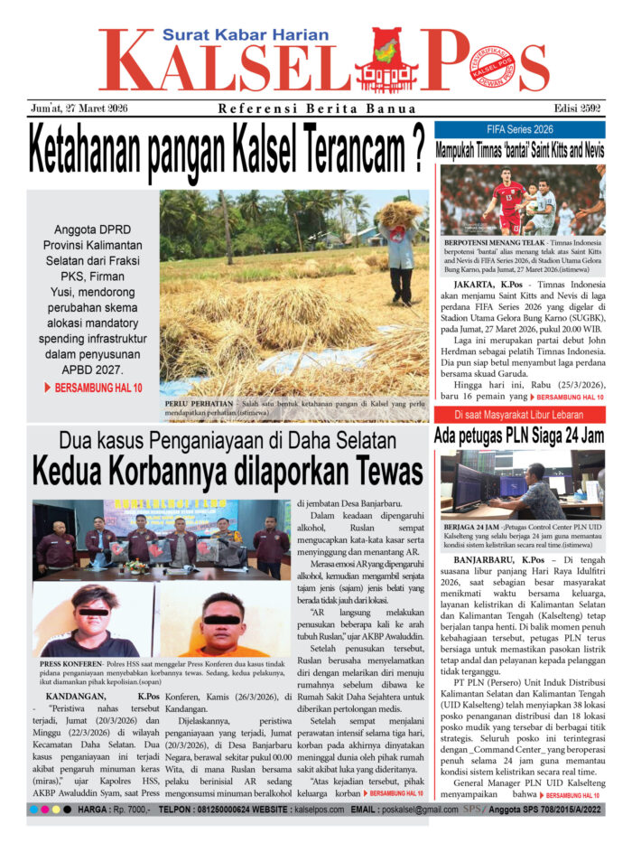 Ketahanan pangan Kalsel Terancam ? Zainal27 Maret 202630 views Ketahanan pangan Kalsel Terancam ? Dua kasus Penganiayaan di Daha Selatan, Kedua Korbannya dilaporkan Tewas FIFA Series 2026, Mampukah Timnas ‘bantai’ Saint Kitts and Nevis Di saat Masyarakat Libur Lebaran, Ada petugas PLN Siaga 24 Jam Download Epaper PDF Disini Bacaan LainnyaTHM ‘Nakal’ harus Ditutup permanenMotor Terbakar di Jalur Mudik Handil BaktiCuranmor jual via Medsos Download Epaper PDF Disini Kalsel Pos Berita Terkini, Kabar Terbaru Hari ini Banjarmasin Kalimantan Selatan dan Nasional Pos terkaitTHM ‘Nakal’ harus Ditutup permanenMotor Terbakar di Jalur Mudik Handil BaktiCuranmor jual via Medsos