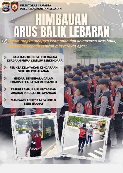 Banjarmasin, kalselpos.com – Direktorat Samapta Polda Kalimantan Selatan mengeluarkan imbauan kepada masyarakat untuk lebih mengutamakan keselamatan dalam menghadapi arus balik Lebaran. Imbauan tersebut disampaikan melalui media publikasi sebagai langkah preventif guna menjaga keamanan dan kelancaran lalu lintas.