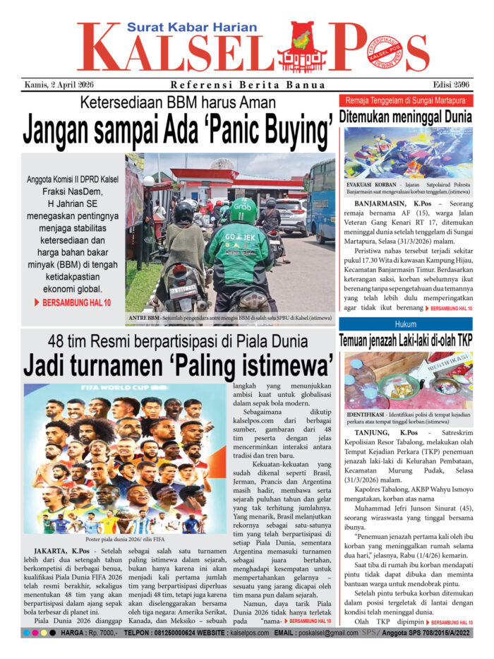 Ketersediaan BBM harus Aman, Jangan sampai Ada ‘Panic Buying’ Zainal2 April 202684 views Ketersediaan BBM harus Aman, Jangan sampai Ada ‘Panic Buying’ 48 tim Resmi berpartisipasi di Piala Dunia, Jadi turnamen ‘Paling istimewa’ Remaja Tenggelam di Sungai Martapura, Ditemukan meninggal Dunia Temuan jenazah Laki-laki di-olah TKP Download Epaper PDF Disini Bacaan LainnyaSidang pembunuhan Mahasiswi ULM, Pecatan Polisi didakwa Pasal BerlapisTimnas ‘menyerah’ 0-1 atas Bulgaria‘Amukan’ Api di Katamso, Lima ruko Ludes Download Epaper PDF Disini Kalsel Pos Berita Terkini, Kabar Terbaru Hari ini Banjarmasin Kalimantan Selatan dan Nasional Pos terkaitSidang pembunuhan Mahasiswi ULM, Pecatan Polisi didakwa Pasal BerlapisTimnas ‘menyerah’ 0-1 atas Bulgaria‘Amukan’ Api di Katamso, Lima ruko Ludes