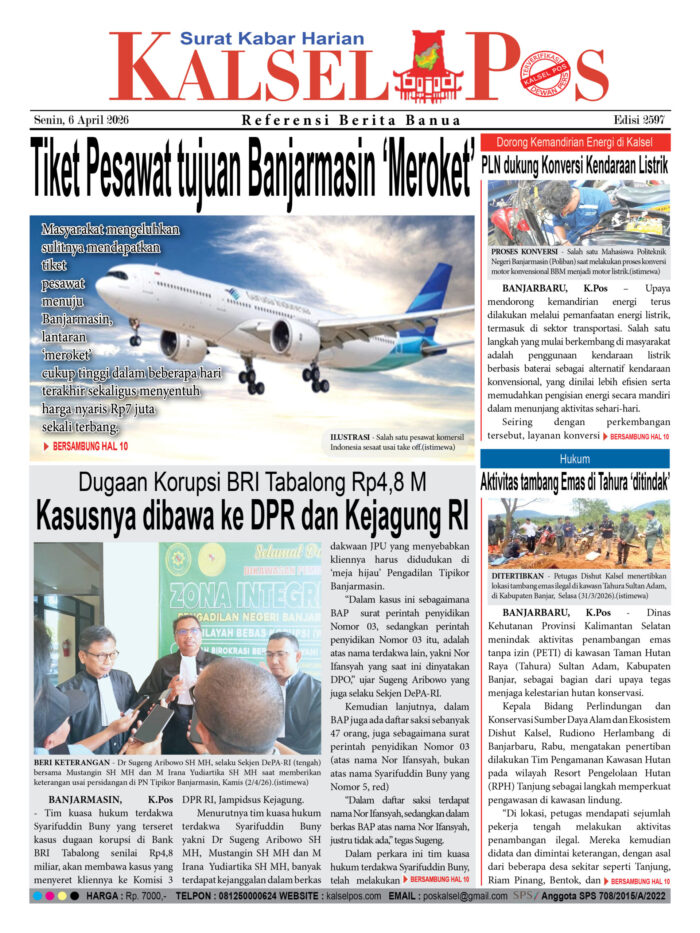 Tiket Pesawat tujuan Banjarmasin ‘Meroket’ Zainal6 April 202642 views Tiket Pesawat tujuan Banjarmasin ‘Meroket’ Dugaan Korupsi BRI Tabalong Rp4,8 M, Kasusnya dibawa ke DPR dan Kejagung RI Dorong Kemandirian Energi di Kalsel, PLN dukung Konversi Kendaraan Listrik Aktivitas tambang Emas di Tahura ‘ditindak’ Download Epaper PDF Disini Bacaan LainnyaKetersediaan BBM harus Aman, Jangan sampai Ada ‘Panic Buying’Sidang pembunuhan Mahasiswi ULM, Pecatan Polisi didakwa Pasal BerlapisTimnas ‘menyerah’ 0-1 atas Bulgaria Download Epaper PDF Disini Kalsel Pos Berita Terkini, Kabar Terbaru Hari ini Banjarmasin Kalimantan Selatan dan Nasional Pos terkaitKetersediaan BBM harus Aman, Jangan sampai Ada ‘Panic Buying’Sidang pembunuhan Mahasiswi ULM, Pecatan Polisi didakwa Pasal BerlapisTimnas ‘menyerah’ 0-1 atas Bulgaria
