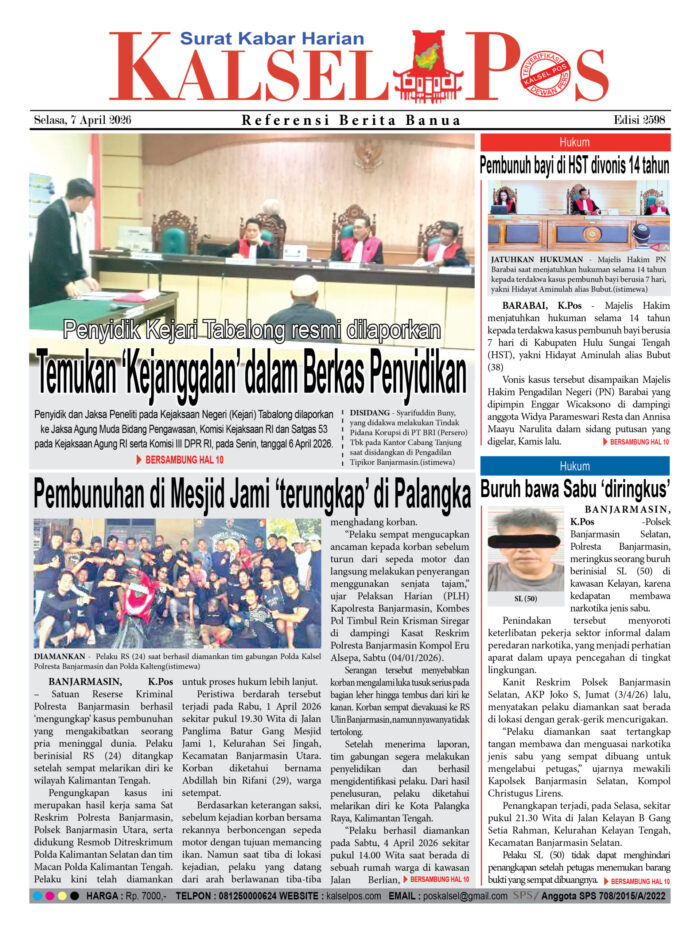 Temukan ‘Kejanggalan’ dalam Berkas Penyidikan, Penyidik Kejari Tabalong resmi dilaporkan Zainal7 April 202652 views Temukan ‘Kejanggalan’ dalam Berkas Penyidikan, Penyidik Kejari Tabalong resmi dilaporkan Pembunuhan di Mesjid Jami ‘terungkap’ di Palangka Pembunuh bayi di HST divonis 14 tahun Buruh bawa Sabu ‘diringkus’ Download Epaper PDF Disini Bacaan LainnyaTiket Pesawat tujuan Banjarmasin ‘Meroket’Ketersediaan BBM harus Aman, Jangan sampai Ada ‘Panic Buying’Sidang pembunuhan Mahasiswi ULM, Pecatan Polisi didakwa Pasal Berlapis Download Epaper PDF Disini Kalsel Pos Berita Terkini, Kabar Terbaru Hari ini Banjarmasin Kalimantan Selatan dan Nasional Pos terkaitTiket Pesawat tujuan Banjarmasin ‘Meroket’Ketersediaan BBM harus Aman, Jangan sampai Ada ‘Panic Buying’Sidang pembunuhan Mahasiswi ULM, Pecatan Polisi didakwa Pasal Berlapis