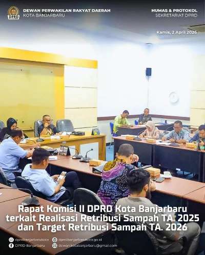 Banjarbaru, Kalselpos.com – Dewan Perwakilan Rakyat Daerah (DPRD) Kota Banjarbaru menggelar rapat bersama instansi terkait guna membahas realisasi retribusi sampah tahun anggaran 2025 serta target untuk tahun 2026. Kegiatan ini berlangsung pada Kamis, 2 April 2026, di Ruang Rapat Intan.