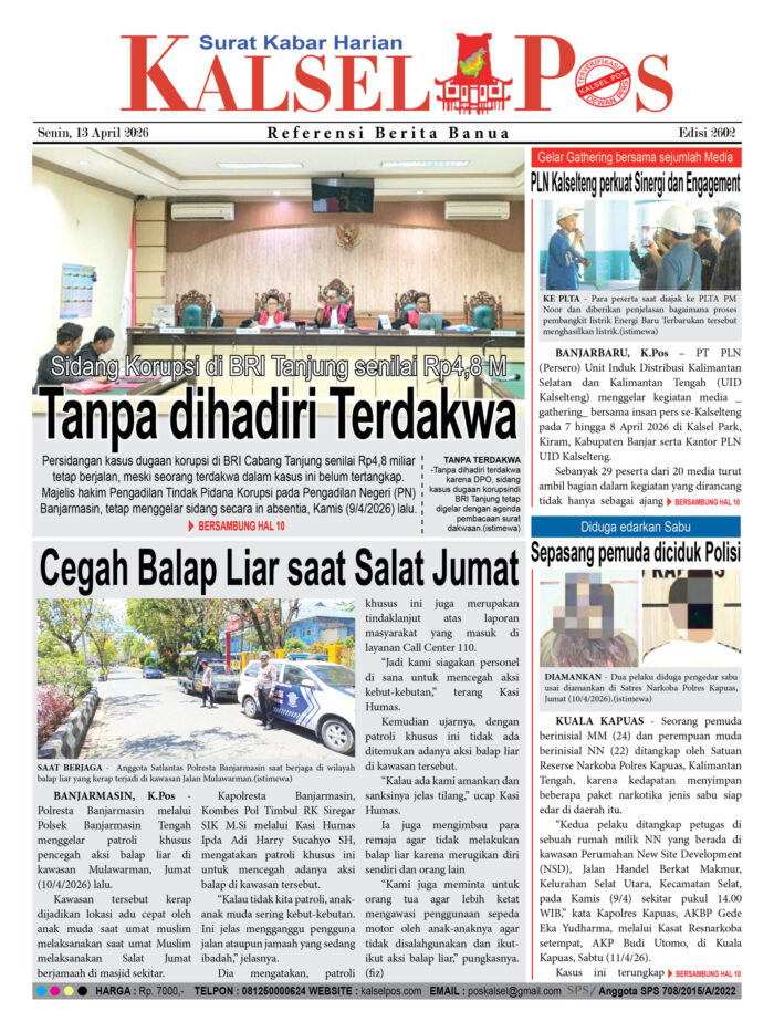 Sidang Korupsi di BRI Tanjung senilai Rp4,8 M Zainal13 April 202667 views Sidang Korupsi di BRI Tanjung senilai Rp4,8 M Cegah Balap Liar saat Salat Jumat PLN Kalselteng perkuat Sinergi dan Engagement Sepasang pemuda diciduk Polisi Download Epaper PDF Disini Bacaan LainnyaPraperadilan Kajari HSU ‘ditolak’Bank Kalteng dibobol Rp16,4 M, Demi Judi SlotSidang pembunuhan Mahasiswi ULM, Sempat dilarang Temui terdakwa M Seili Download Epaper PDF Disini Kalsel Pos Berita Terkini, Kabar Terbaru Hari ini Banjarmasin Kalimantan Selatan dan Nasional Pos terkaitPraperadilan Kajari HSU ‘ditolak’Bank Kalteng dibobol Rp16,4 M, Demi Judi SlotSidang pembunuhan Mahasiswi ULM, Sempat dilarang Temui terdakwa M Seili