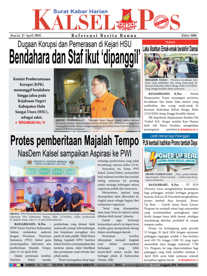 Dugaan Korupsi dan Pemerasan di Kejari HSU , Bendahara dan Staf ikut ‘dipanggil’ Zainal17 April 202655 views Dugaan Korupsi dan Pemerasan di Kejari HSU , Bendahara dan Staf ikut ‘dipanggil’ Protes pemberitaan Majalah Tempo, NasDem Kalsel sampaikan Aspirasi ke PWI Laka libatkan Emak-emak berakhir Damai Lebih Hemat bagi Pelangganm PLN kembali hadirkan Promo tambah Daya Download Epaper PDF Disini Bacaan Lainnya18 IUP Tambang di Banua, Diduga beroperasi tanpa miliki AMDALPembunuh Bidan divonis Seumur HidupAyah mahasiswi ULM korban Pembunuhan, Tolak permintaan Maaf terdakwa M Seili Download Epaper PDF Disini Kalsel Pos Berita Terkini, Kabar Terbaru Hari ini Banjarmasin Kalimantan Selatan dan Nasional Pos terkait18 IUP Tambang di Banua, Diduga beroperasi tanpa miliki AMDALPembunuh Bidan divonis Seumur HidupAyah mahasiswi ULM korban Pembunuhan, Tolak permintaan Maaf terdakwa M Seili