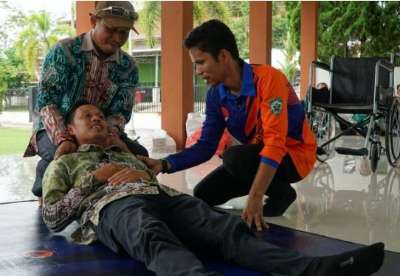 Kegiatan dilanjutkan dengan simulasi penyelamatan korban bertempat Ruang Terbuka Hijau para peserta tampak antusias saat praktik evakuasi korban.