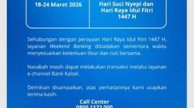 Banjarmasin, kalselpos.com – Bank Kalsel resmi mengumumkan penyesuaian jadwal operasional kantor selama periode libur nasional kalselpos.com : Berita Terkini, Kabar Terbaru Hari Ini Banjarmasin Kalsel Kalimantan Nasional dan Dunia